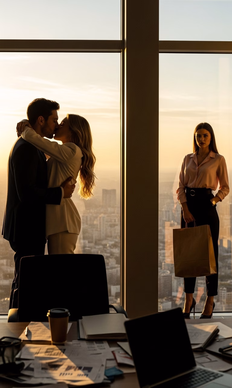 They were wrapped together—Nathan leaning against his desk, Stephanie’s hands around his neck, her skirt disheveled, his tie loose. The kind of intimacy that doesn’t develop overnight.