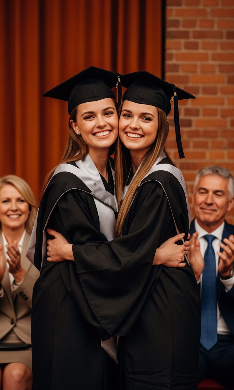 The university auditorium buzzed with excitement. Rows of chairs filled with proud families, camera flashes popping like fireworks. Chloe and I sat together, our last names too close alphabetically to be separated.